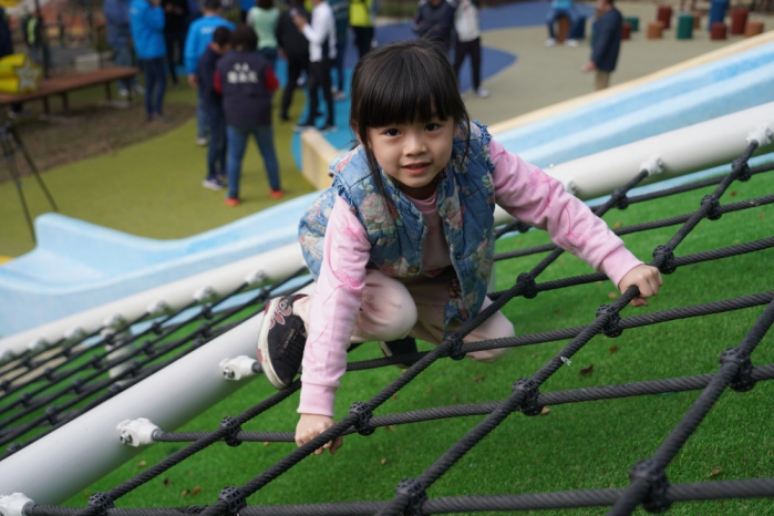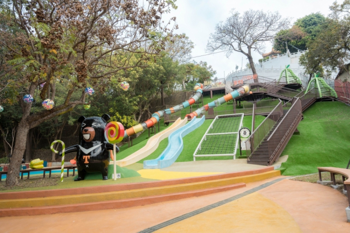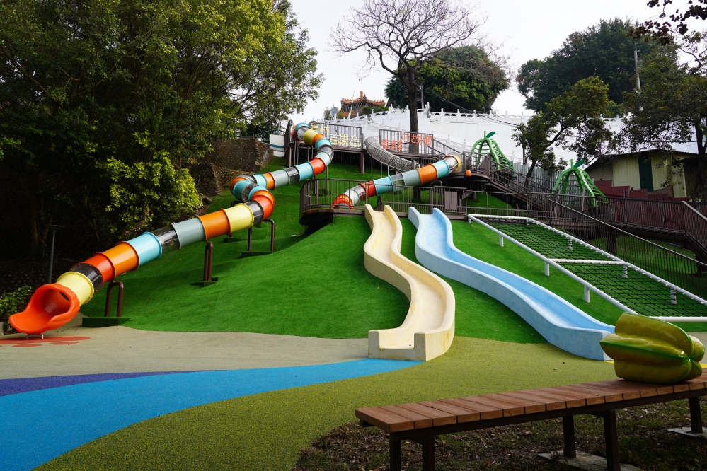 另外1座長達26公尺的管狀特色溜滑梯,2座10公尺磨石子材質溜滑梯。溜滑梯區採用繽紛亮麗色彩配置,添置攀爬網、彈跳床、跳樁、攀岩、遊戲土丘等多元遊憩設施,提供家長和大小兒童豐富遊戲體驗。