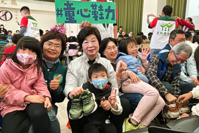 今日的發放現場,由一名阿祖和家扶兒「小友」代表家扶兒和家長表達感謝之意,阿祖哽咽說出心裡的感受,她說,她獨自照顧三個孫子,光吃飽就很困難,更遑論買新鞋,祖孫非常珍惜這份禮物。