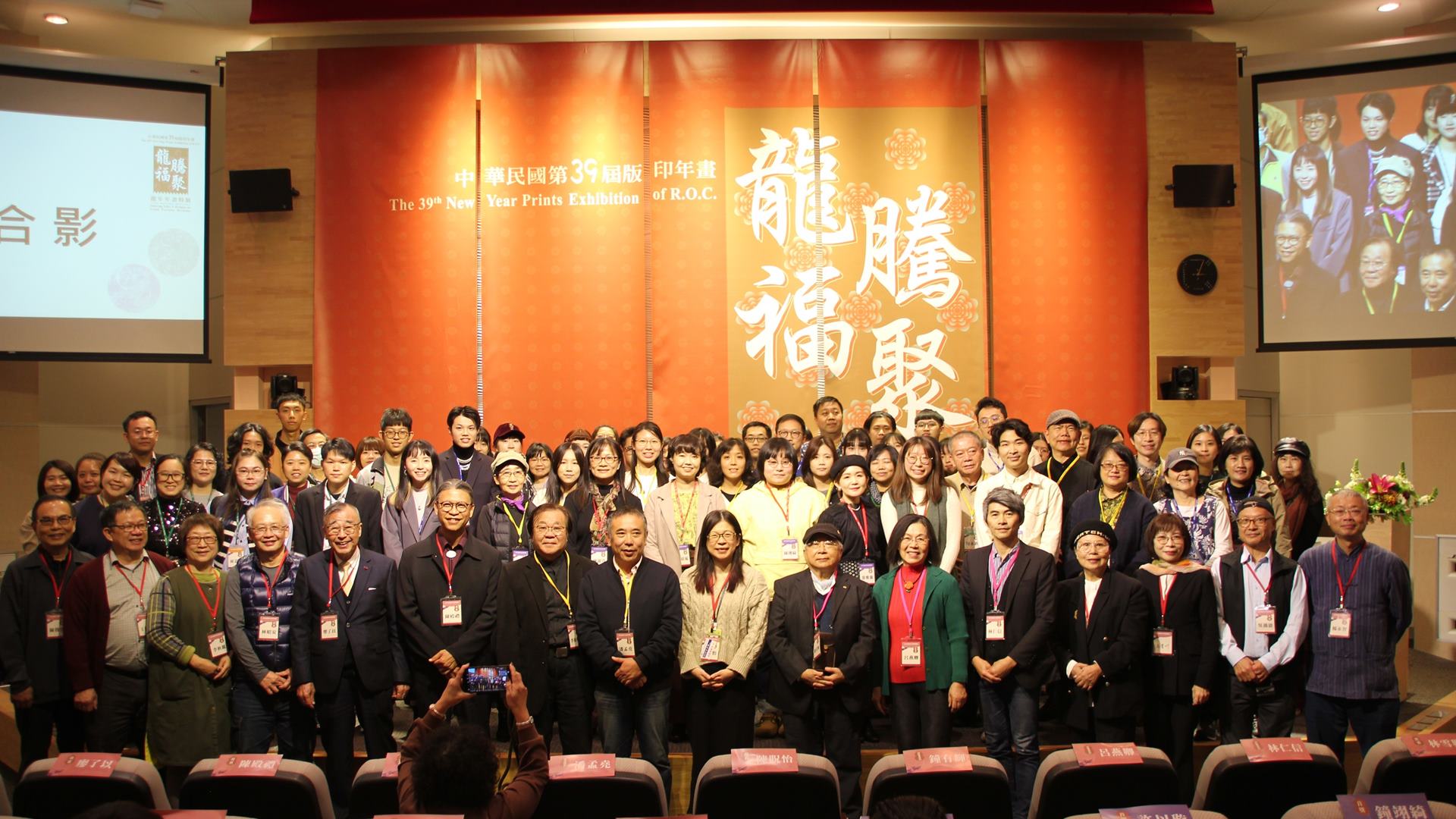 ▲國美館陳貺怡館長(前右8)、評審委員、委託創作藝術家及第39屆中華民國版印年畫徵選得獎者合影。(國美館提供)