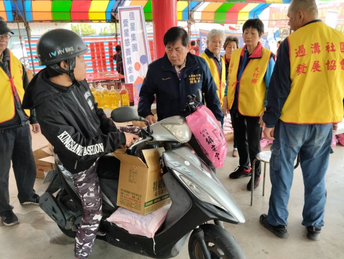 賴村長說,2017年開始,由過溝村辦公處與社區協會舉辦「寒冬送暖、冬令救濟、送春聯」活動,發起緣由是鎮安宮主委賴耀寬,發願遵從仙母遺願,捐款一百萬元,濟助村內弱勢村民,成立慰問基金專戶,專款專用,除外,協會今年在地企業的信星集團愛星基金會,贊助救濟物資。