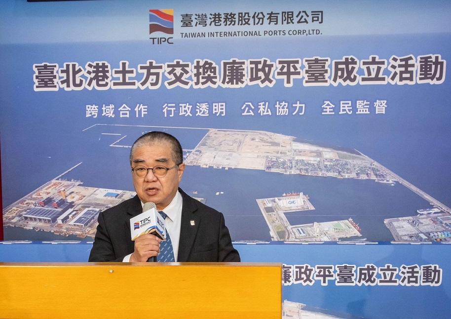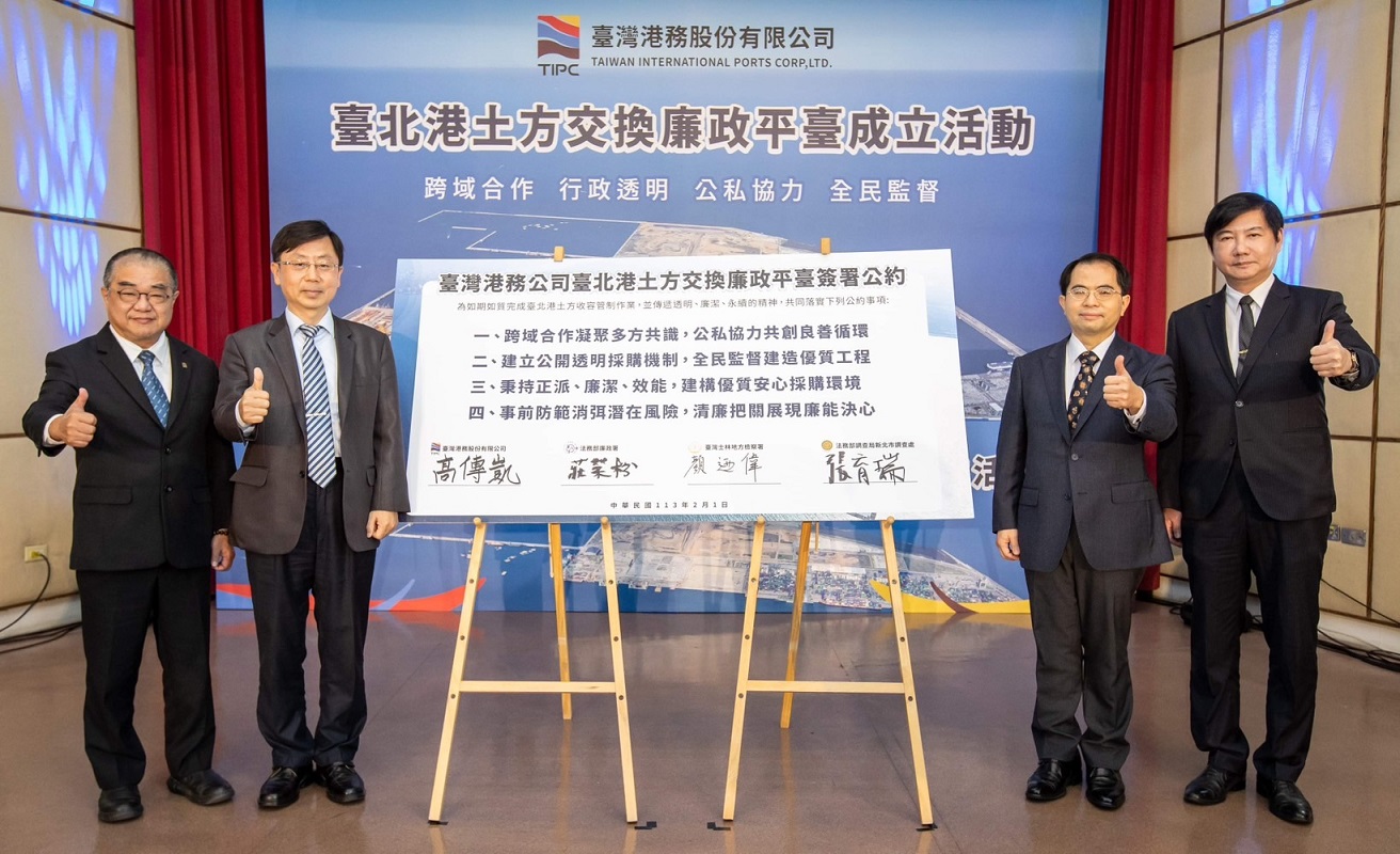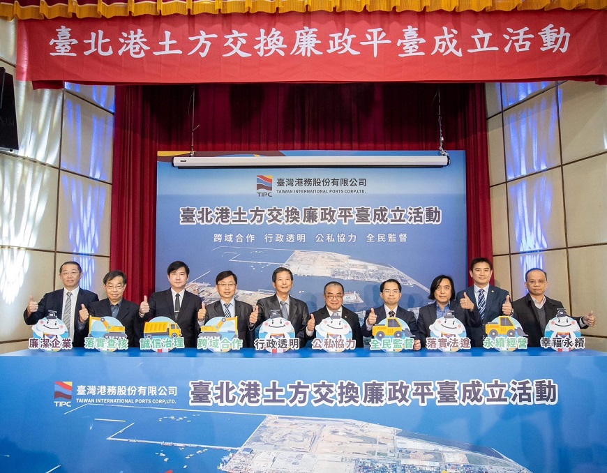 廉政平臺啟動儀式,揭示「跨域合作」、「行政透明」、「公私協力」、「全民監督」,及傳遞透明、廉能及永續的精神。會中並由港務公司、檢察、廉政及調查等單位進行公約簽署,對外宣示並展現決心,務求如期、如質、無垢,完成臺北港土方收容管制作業,對土方交換意圖不法獲利者的威嚇遏阻,極具正面的意義。