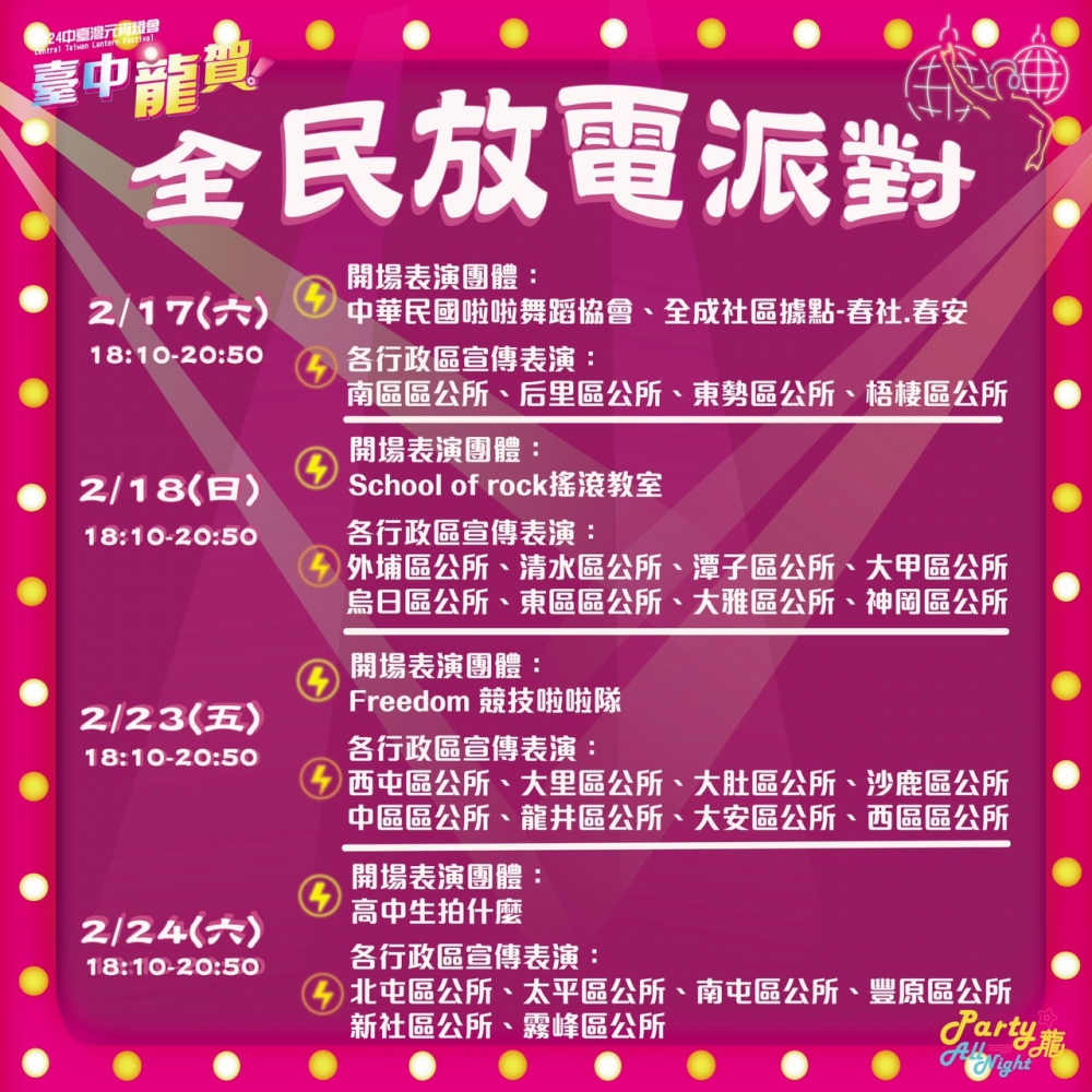 民政局長吳世瑋指出,民政局「Party 龍」燈區可以找到台中市各行政區代表性燈組,包括利用角色人物、建築景觀、宗教巡禮、地方特色設計的特色燈組,燈區內的「龍好跳大舞池」也規劃各區「龍好耍,相揪拿好禮」派對活動,由各行政區每周假日輪番上陣展演,包含可愛的區里特色吉祥物現場互動、樂團精彩演奏、有獎徵答、打卡送精美小禮等豐富內容,燈會期間每天龍熱鬧、龍好玩,歡迎大家攜家帶眷一同前來賞燈,歡喜熱鬧過元宵。