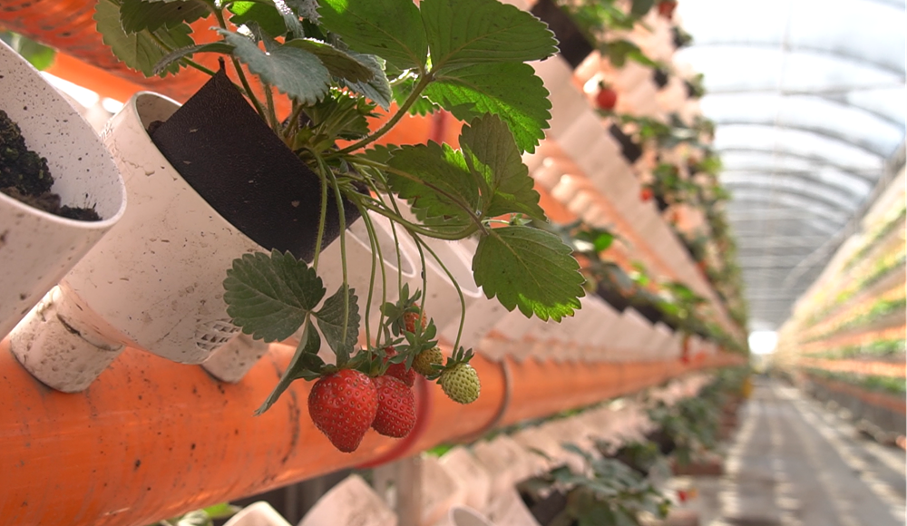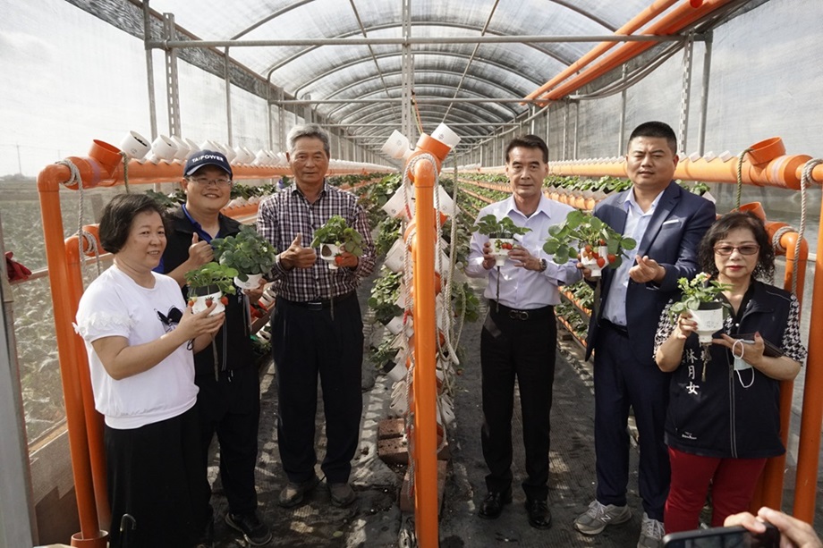 褒忠鄉公所與新湖合作農場攜手,透過改良式魚菜共生植物牆種植的草莓,為農曆新年增添了一道喜氣。(記者蘇榮泉攝)