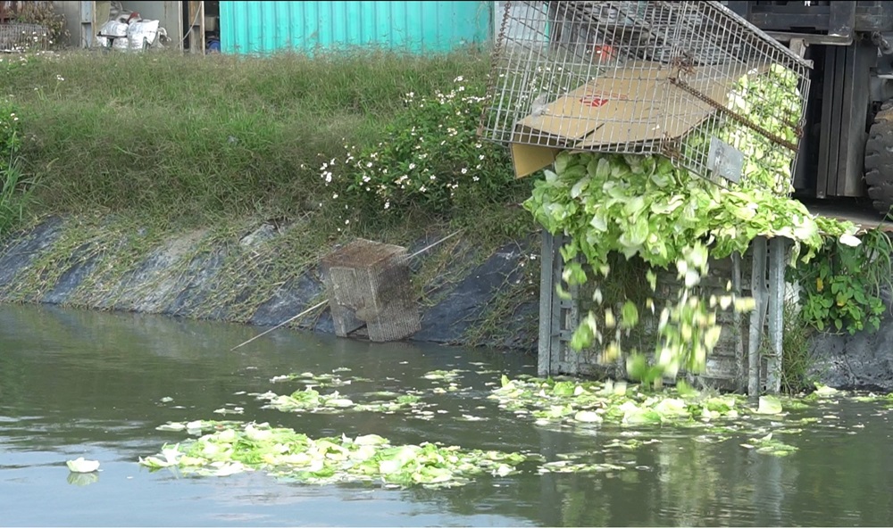 農場生菜裁切後剩餘的邊角料放進魚塭餵食草魚,再將草魚消化排泄後的肥水抽出至魚塭旁植物牆。