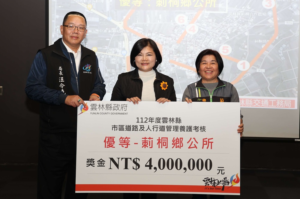 縣長張麗善頒獎表揚市區道路及人行道管理養護考核優等-莿桐鄉公所,獲得獎金400萬元。