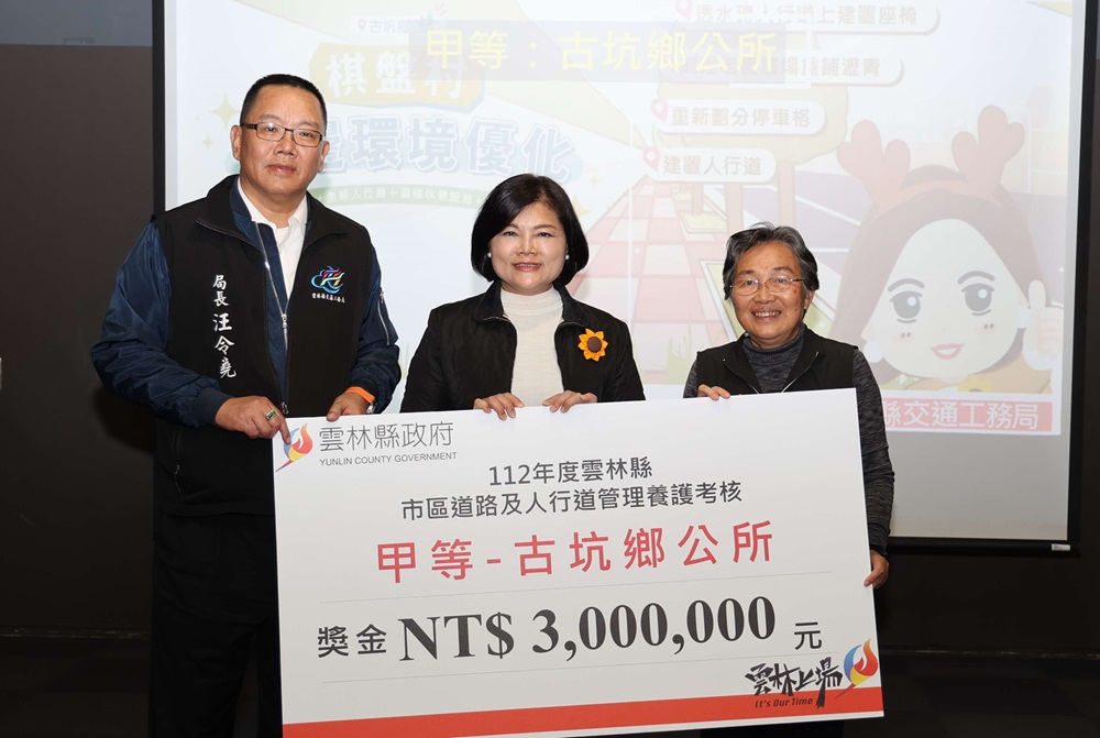 縣長張麗善頒獎表揚市區道路及人行道管理養護考核甲等-古坑鄉公所,獲得獎金300萬元。