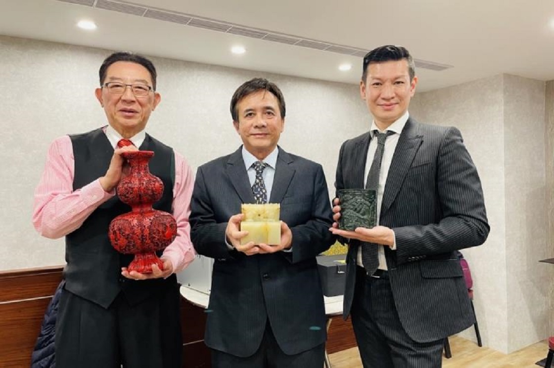 ▲(左至右)琴書潤收藏家廖少荃持清乾隆剔紅八寶紋瓶、前國立故宮博物院公共事務室主任蘇慶豐持皇帝之寶的玉璽、執行長蔡育志持乾隆墨翠筆筒合影。