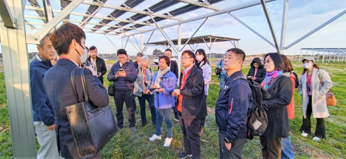 王縣長和縣農會總幹事張建豐等考察團甫抵日本,即驅車前往千葉縣環境再生型有機農業,針對農電共生課題進行參訪,由市民能源創辦要角宮下朝光、椿茂雄等人介紹日本千葉能源株式會社農電共生情形,在國內普遍以屋頂型和地面型太陽光電為主要推廣方案,日本則採場型折衷方案,種田兼種電,以種電20公頃經驗年收近台幣600萬元以上,不但讓農地農用,也有種電收入,創造多贏。