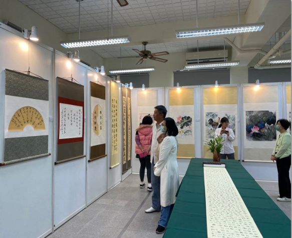 【記者楊川欽台中報導】「國立暨南大學112學年度「文化列車:一堂無聲的人文素養課」書畫家林隆達、吳三賢、陳華聯合書畫展,於本月4日至8日在台中市立大里高中圖書館展出,展出作品共計四十二件,其中陳華的國畫展出分別有山水畫、花鳥畫、仕女圖等,主題有台中湖心亭、玉山主峰、阿里山、日月潭等本土地景,另外知名書畫名家林隆達、吳三賢書法作品,包含有展開數公尺的白居易的「琵琶行」、李白「早發白帝城」、王之渙「涼州詞」、蘇東坡的「定風波」等膾炙人口的詩詞及中外名言佳句。