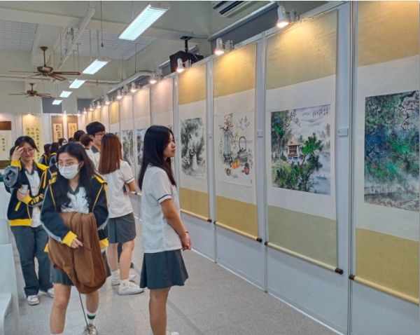 大里高中在張仲凱校長的積極爭取下,非常榮幸能搭上國立暨南大學「一堂無聲的人文素養課」這列藝術文化列車。展場布置溫馨典雅,更能襯托出作品的美感與質感,希望透過這班列車拉近與年輕學子的距離,啟發學生對藝術和文化的熱愛與探索,學生可以暫時逃離課本裡的知識,遁入「畫中有話」的水墨中,隨著墨色渲染而得到放鬆;國文課本裡的名言佳句,化為藝術作品,用無聲的方式呈現,提供不同的美感體驗。