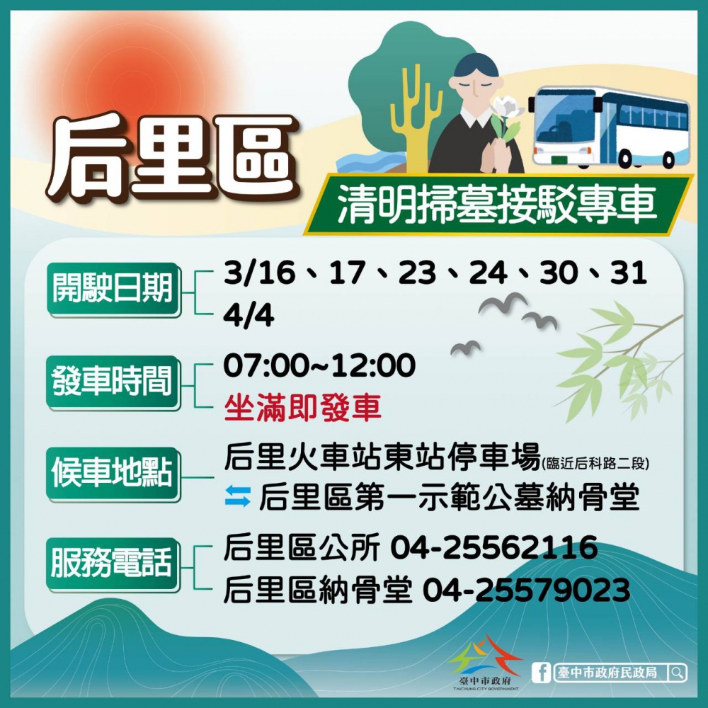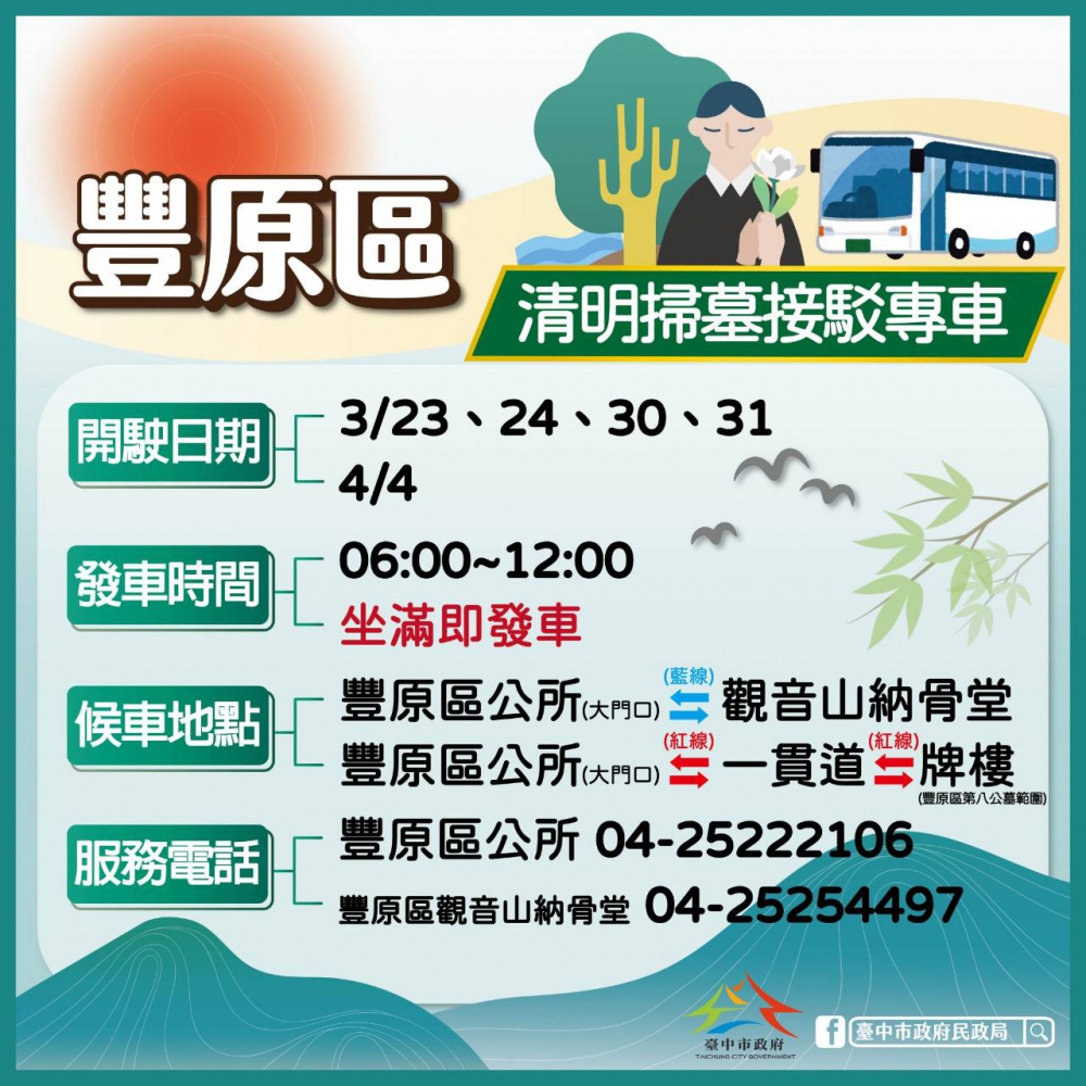 吳世瑋提到,為避免公墓附近交通壅塞,3月9日至4月4日區間假日時段,將於豐原、后里、沙鹿、太平及霧峰等5區提供清明掃墓免費接駁專車,其中豐原區採藍、紅兩路線,起站均於豐原區公所(大門口)搭乘,藍線至豐原區觀音山納骨堂、紅線則經一貫道至牌樓(豐原區第八公墓範圍);后里區於后里火車站東站停車場(臨近后科路二段)搭乘至后里區第一示範公墓納骨堂。