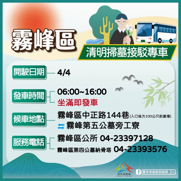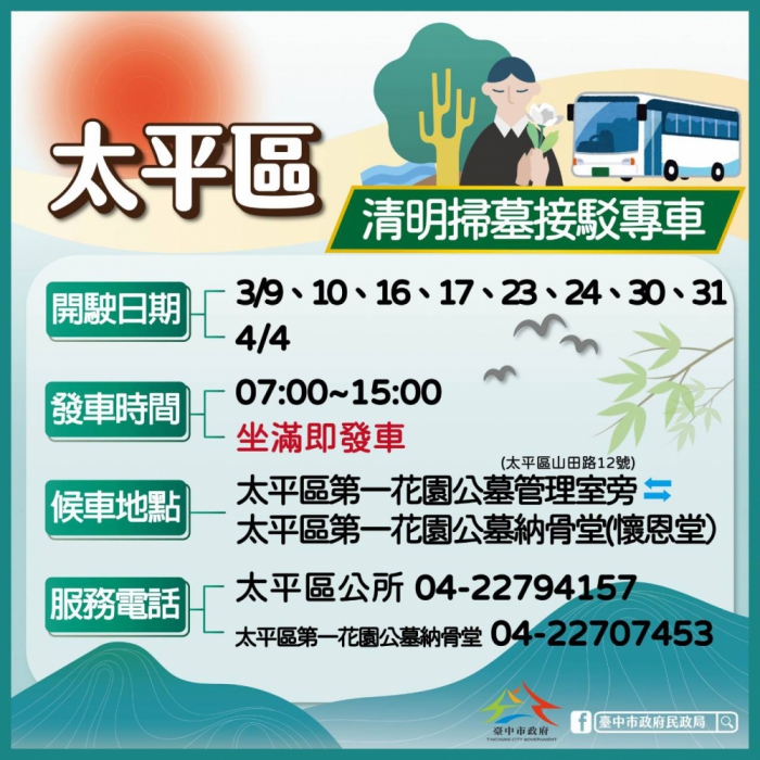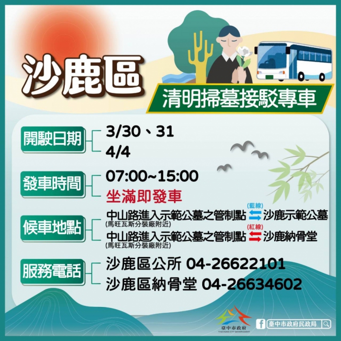 此外,沙鹿區由中山路進入示範公墓之管制點(馬旺瓦斯分裝廠附近)搭乘,藍線前往沙鹿示範公墓、紅線則前往沙鹿納骨堂;太平區則於太平區第一花園公墓管理室旁至太平區第一花園公墓納骨堂(懷恩堂);霧峰區則於霧峰區中正路144巷(入口後方100公尺前廣場)搭乘至霧峰第五公墓旁工寮,假日掃墓將視各墓區情況進行交通管制,禁止私人車輛進入墓區,歡迎民眾多加運用。民眾也可提前或利用平日前往祭祀,避開假日人潮,或利用「線上祭拜系統」追思,慎終追遠誠意不減。