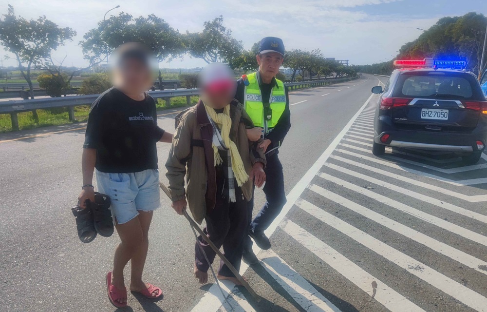 老翁與外傭在台78線快速道路22K處行走,情況極為危險。警方獲報後立即趕到現場,成功將老翁安全帶離快速道路。(記者蘇榮泉翻攝)