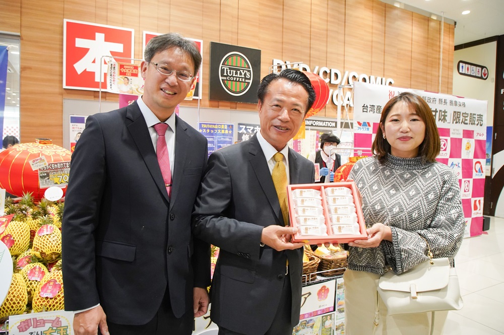 現場由翁縣長親自擔任銷售員,許多日本消費者紛紛試吃後讚不絕口,甚至有人直接購買回家分享。(嘉義縣政府提供)
