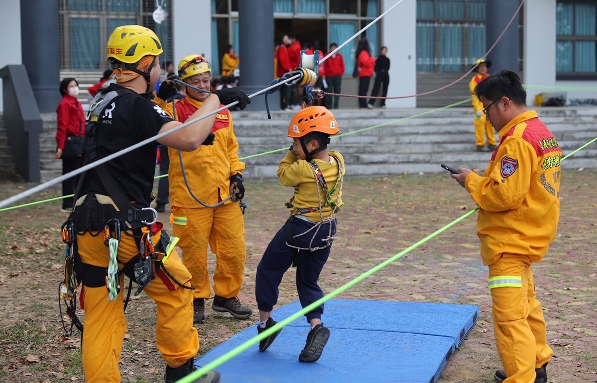 消防局支援體驗活動及技能操作,包含緩降機、射水操作、消防車體驗、CPR+AED、滅火器及滑降實作等。