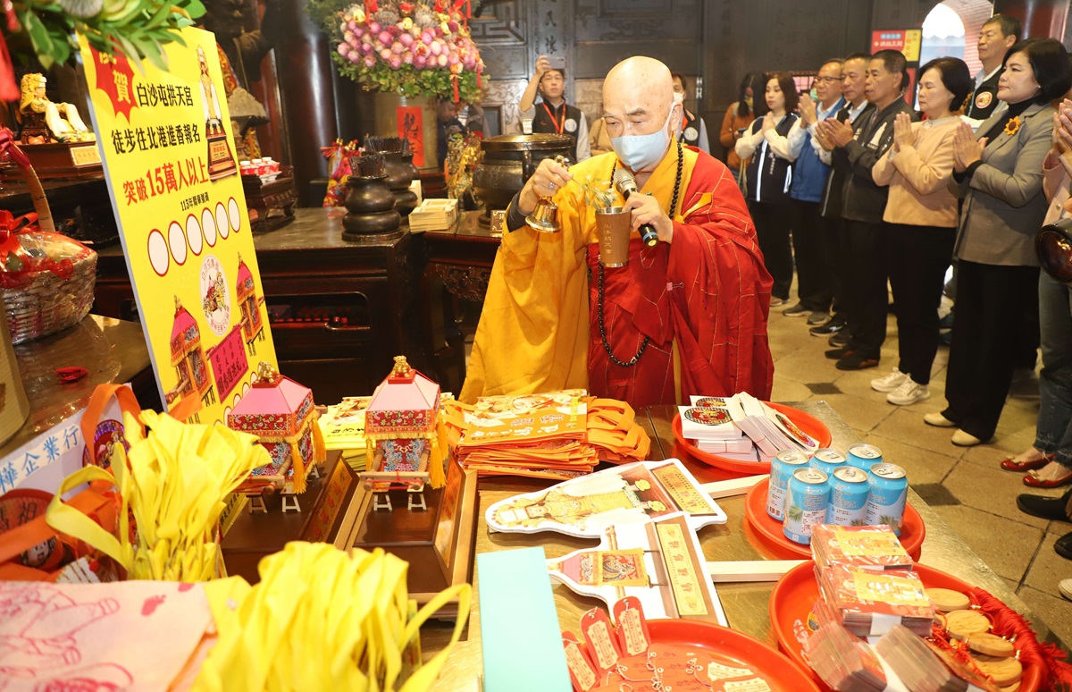 結緣品灑淨祈福儀式在朝天宮正殿舉行,由朝天宮會茂法師為結綠品灑淨祈福。