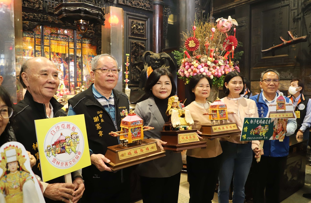 縣長強調,白沙屯媽、山邊媽進香是國家的重要無形文化資產,朝天宮進香今年還獲得文化部公告為國家重要無形文化資產,每年信徒人數都在不斷增長。她感謝雲林至善文化協會匯集信徒的愛心,製作並贈送給隨香信徒的各種結緣品,今年更加碼贈送了一尊交趾陶媽祖及2頂粉紅超跑迷你神轎,以公開抽獎的方式回饋給信徒。