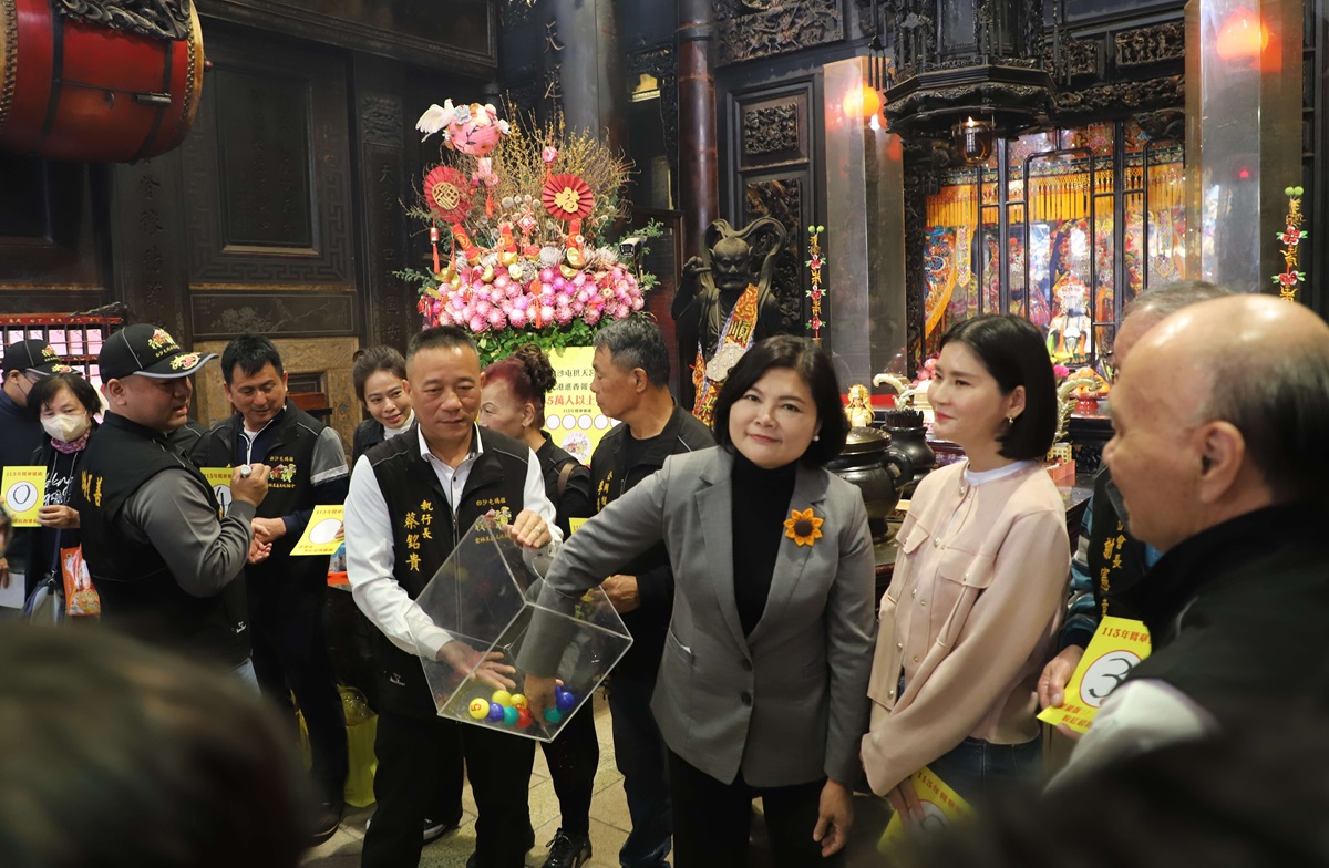 縣長張麗善抽出一尊交趾陶媽祖及2頂粉紅超跑迷你神轎得主。