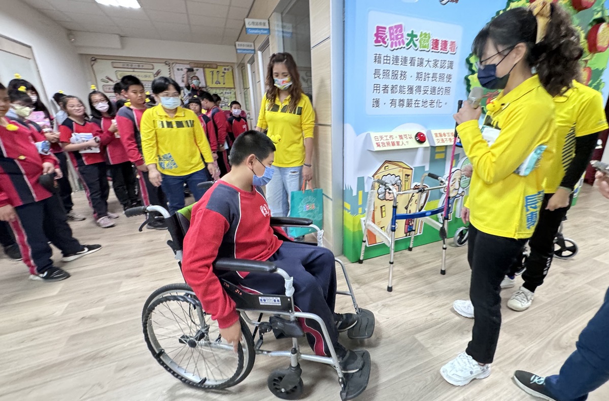 照專「黃衣天使」以輕鬆、活潑、貼近生活的方式向學童介紹長照展區,讓學童現場體驗行動輔具。