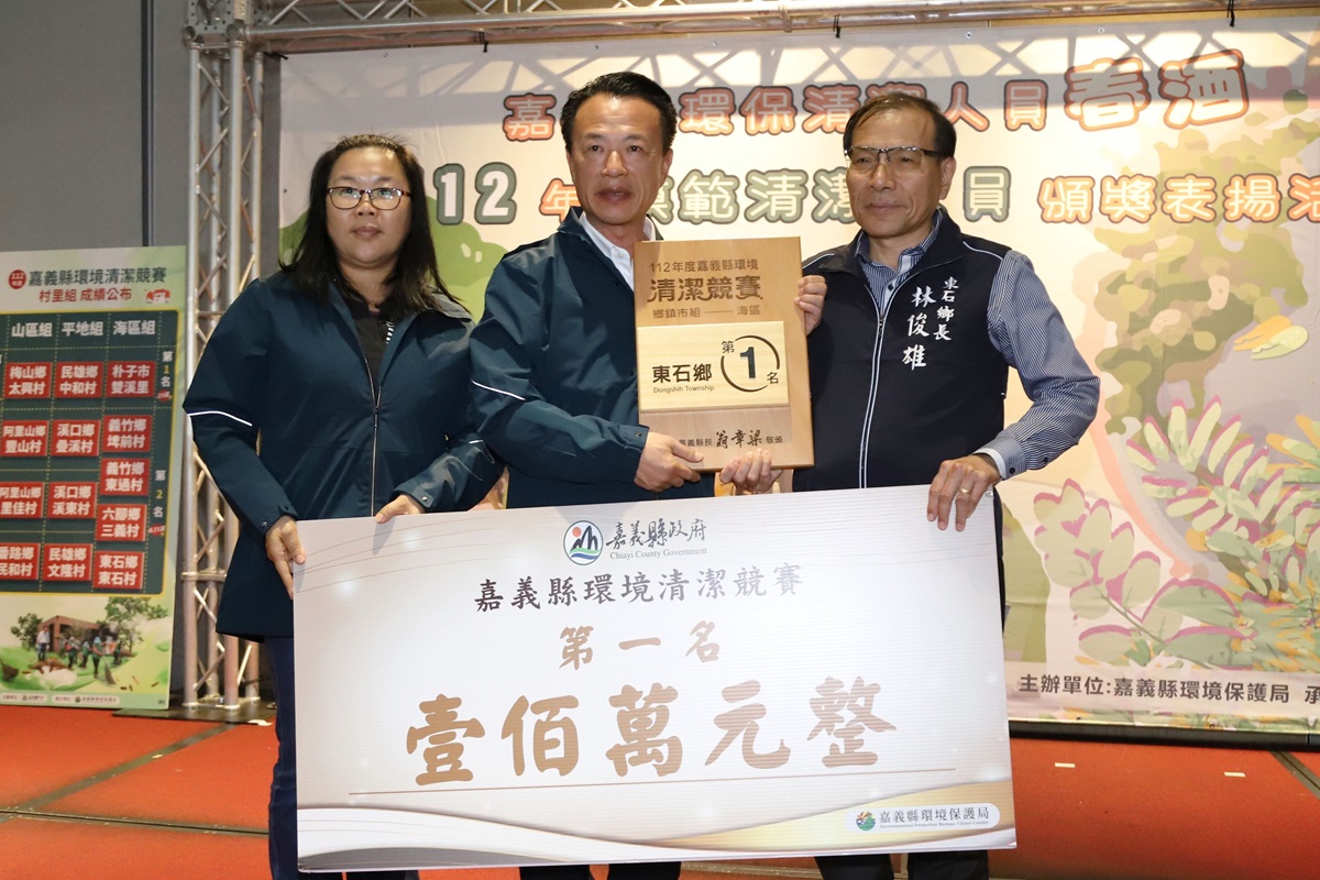 今同時頒發112年環境清潔競賽考核,山、海、平原各獲獎鄉鎮市及村里,鄉鎮市長親臨現場接受殊榮,各區第一名獲百萬獎金,環境管理署南區管理中心主任石秉鑫也出席給予鼓勵,他表示「庄內就是阮ㄟ厝內」的環境政策激勵民眾重視環境,逐一改善鄉鎮內不同的髒亂問題,成功守護嘉園。
