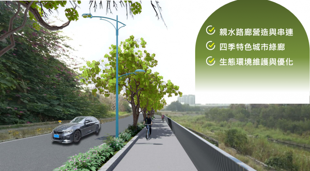 觀旅局指出,此工程利用旱溪右岸堤頂腹地,將原有自行車道移設至堤頂上,興建自行車道並進行整體景觀改善,發揮水綠生態廊道自然景觀特性,提升近水漫遊城市自行車道魅力,營造出兼具休閒、遊憩及綠美化功能之優質自行車友善環境,並串連全國環島自行車路線,以推動台中市為運動城市的目標。