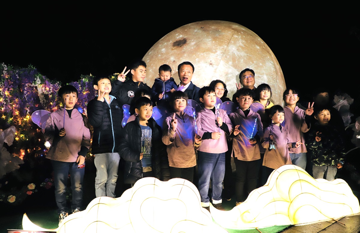晚間正式點燈亮相,夢幻燈光與獨特星球外型十分吸睛,縣長翁章梁、縣議員陳信文及許多瑞里社區業者皆一同到場點燈。(記者蘇榮泉攝)今夜點燈儀式中,由瑞里國小學生們裝扮成紫藤仙子熱鬧開場,與縣長翁章梁等人一同點亮「浪漫紫藤星球」,為整座山城增添溫馨浪漫氣氛。