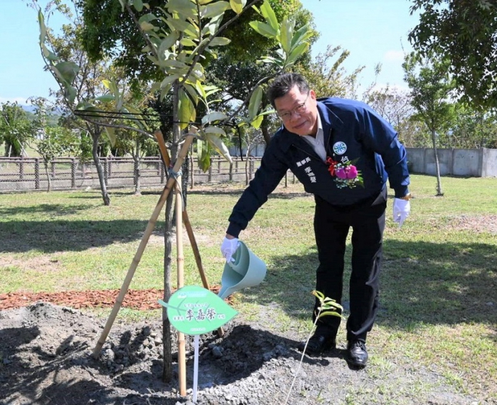 發言人說,台水董事長李嘉榮、總經理李丁來,除以鏟子栽下原生毛柿樹苗、親自澆水外,並與來賓共同體驗葉拓,在台水五十週年「固碳救地球」葉拓紀念布上留下珍貴綠色足跡,表達台水對環境永續經營的關懷理念。