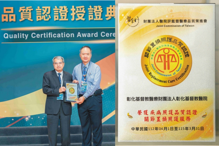 謝承樸醫師說,彰基醫學中心提供高品質醫療服務,除台灣首家通過國際JCIA-CCPC 臨床照護計畫認證外,也通過國內醫策會疾病照護品質認證「關節置換」照護認證。