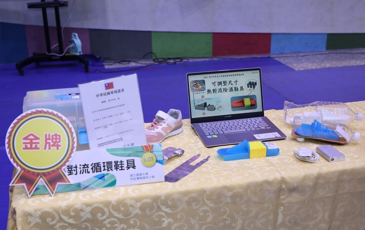 嘉大附小五年級王子昀和林君翰兩位同學共同創作的「可調整尺寸熱對流除濕鞋具」,延續去年的世界金牌榮譽。