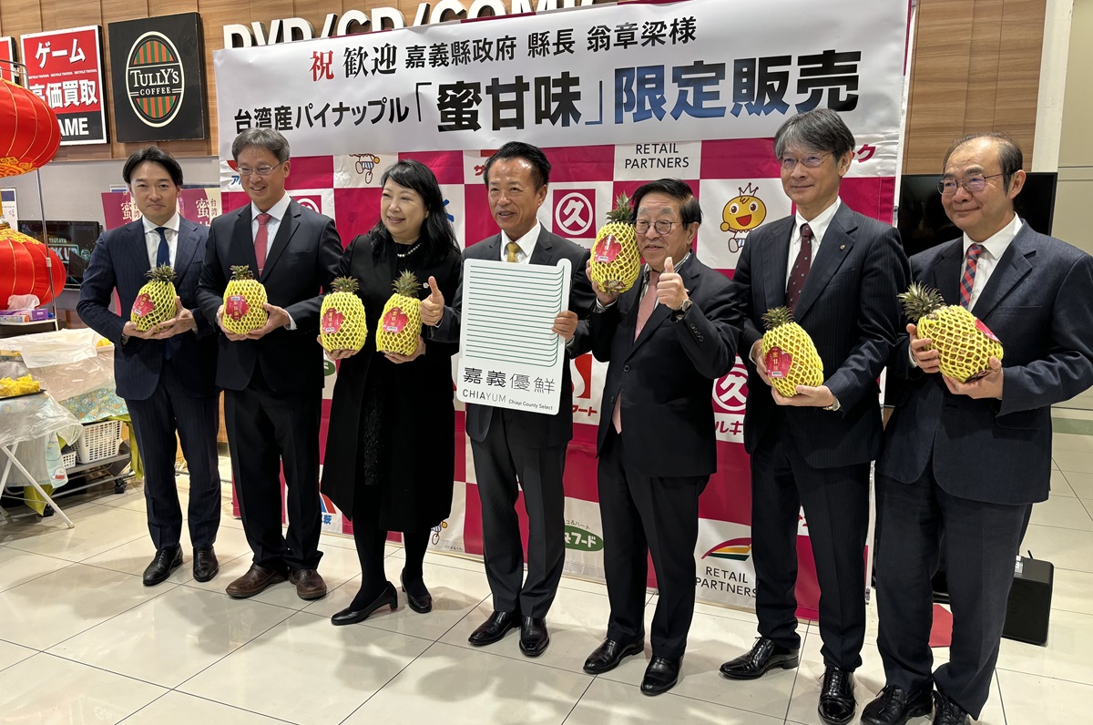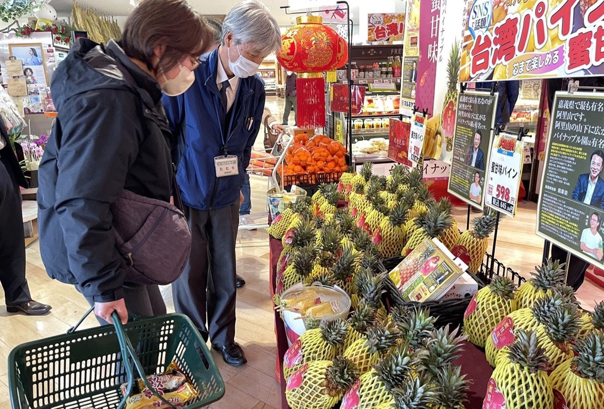 日本丸久、丸共和丸宮株式會社旗下共有270家超市分店,引進嘉義縣鳳梨,後續有更多種類的生鮮農產及加工品導入日本市場。(嘉義縣政府提供)縣府的目標是要將小農和業者的產品,依據不同的產品性質推廣至合適的通路。未來縣府將持續整合產銷供應鏈、參加國際食品展、辦理海外商機媒合會、與國外通路建立出口管道,擴展海外市場提升農民及業者收益。