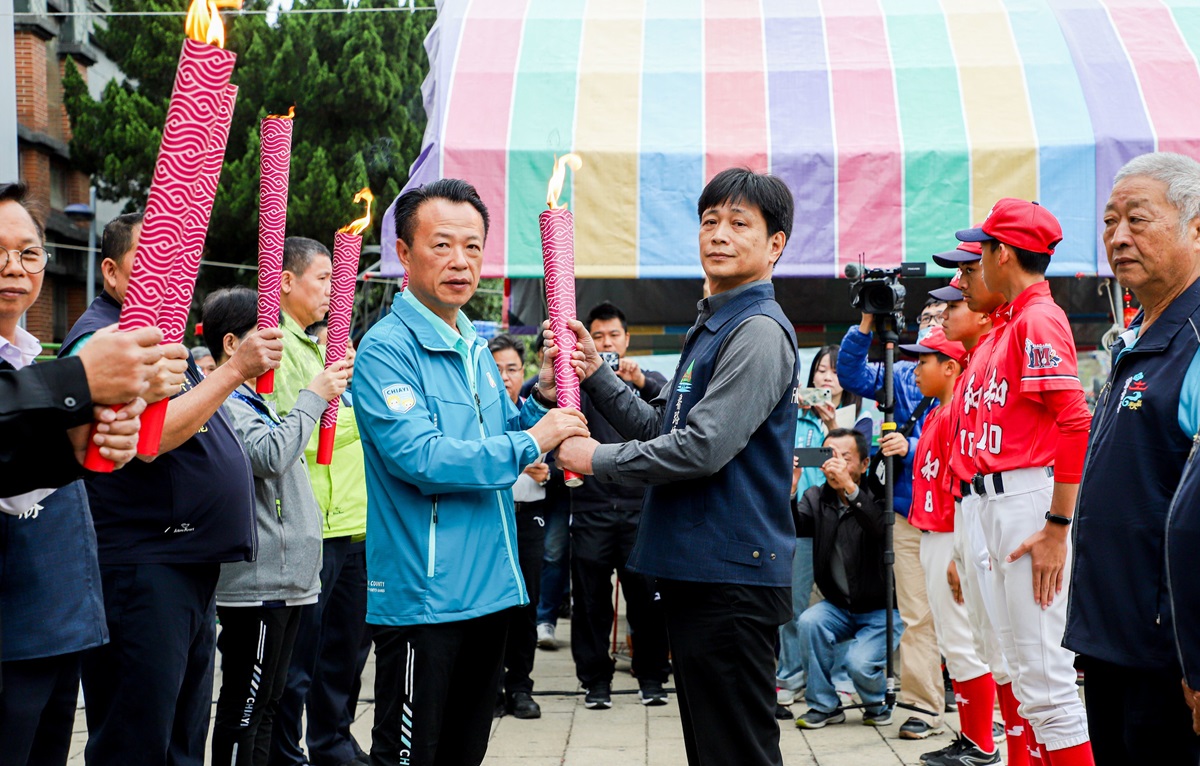 聖火由翁縣長點燃,接著傳遞給紫雲寺廟方主委及民和國中代表選手。