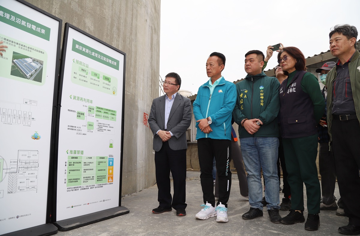 環保局指出,沼氣回收能作為發電燃料,結合民間多年綠能經驗的能源公司,採用工研院生物脫硫沼氣預處理技術,有效去除硫化物達90%以上,每年處理約25,000噸的豬糞尿水,廢水厭氧處理後,沼氣最大發電量達8萬度,約可供22個小家庭用電,以及相當4.07公頃的森林減碳效益,沼渣沼液更可提供鄰近約28.6公頃農田肥分,充分落實畜牧業循環經濟,本案是「產官學民研」共同合作的成功案例之一。