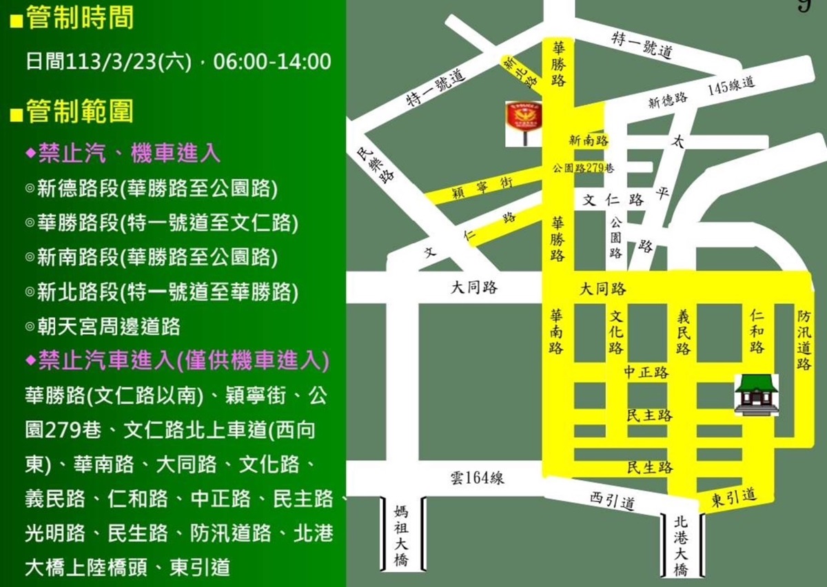 2、返程:朝天宮周邊道路禁止汽、機車進入;華勝路(文仁路以南)、穎寧街、公圆279巷、文仁路北上車道(西向東)、華南路、大同路、文化路、義民路、仁和路、中正路、民主路光明路、民生路、 防汛道路、北港大橋上陸橋頭、東引道則禁止汽車進入。
