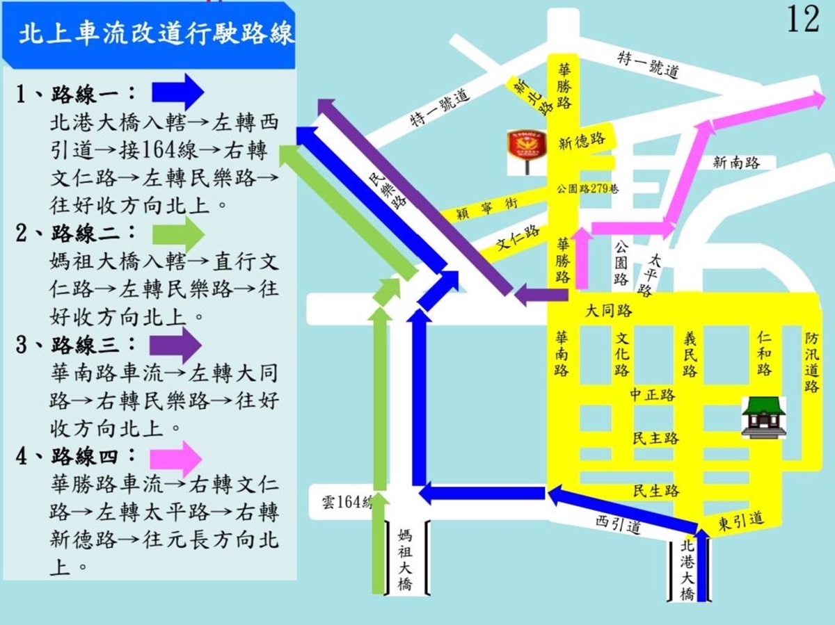 (1)路線一:台19線入轄一右轉特一號道一左轉民樂路→右轉文仁路→媽祖大橋或北港大橋。