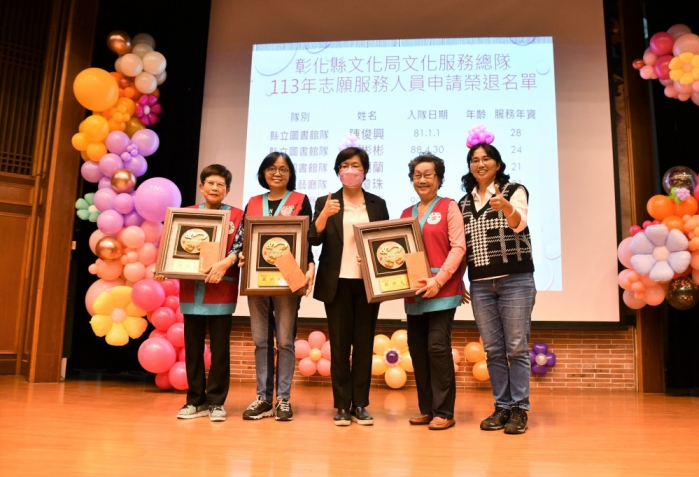 王縣長表示,縣府獎勵高齡資深文化志工長期服務,建立榮退機制,這次有8名志工接受榮退表揚,有3人年齡達80歲以上,平均年資22年以上,其中,施彬彬女士81歲,積極熱心,協助縣立圖書館櫃檯流通、諮詢、上架和整架等工作。陳富美女士82歲,在縣立美術館服務台服務,協助郵件整理。陳俊興先生80歲,協助規劃志工制度和培訓,樹立志工制度典範,成立影劇協會,推展戲劇藝術教育,獲良好績效,深受文化局和民眾讚揚,活到老學到老精神,值得嘉許。