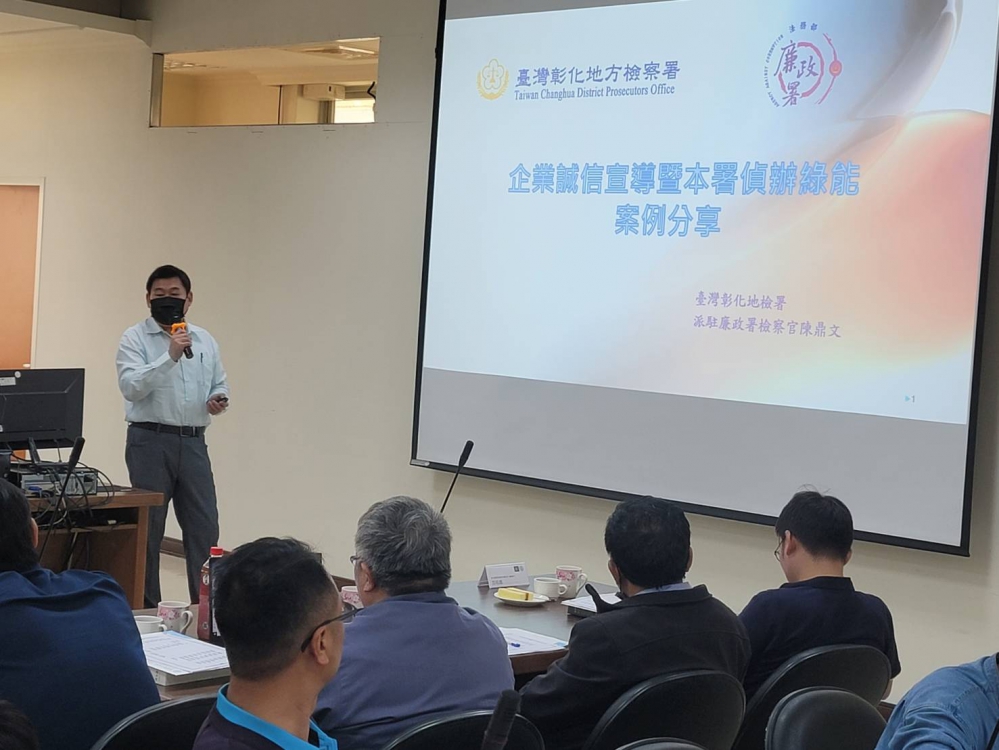 座談會邀檢察官陳鼎文講授「企業誠信」,另由中港警察總隊分享陳抗經驗,再由廠商針對再生能源產業發展和綠能產業發展犯罪等議題交換意見。