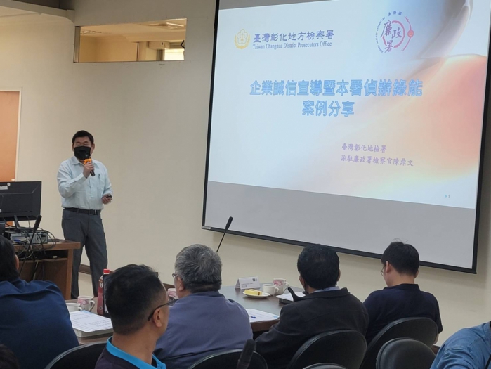 廉政平臺企業誠信座談,由彰化檢察長張曉雯和台電再生能源處長蔡英聖共同主持,與會單位除台中市調處,航調處、中港警衛等查緝機關外,還邀施工廠商(包括富崴能源、星能、富翔營造、威京電氣、挪威商立恩威驗證、中興工程顧問、吉興顧問、世紀鋼、東方風能),以凝聚公私部門共識,建立反貪腐夥伴關係。