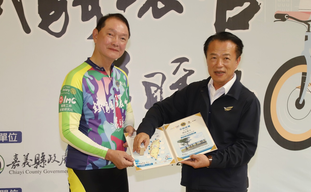 【記者蘇榮泉嘉義報導】國際獅子會300A-2區與中華民國國際工商經營研究社聯合會(IMC全國聯合會)以鐵馬環台的方式,聯合資助各縣市政府國中小家境清寒弱勢學生獎學金,鐵騎隊伍3月18日自台北市出發,以逆時鐘方向環台,於總里程數1,008公里的行程中,將行遍台灣本島19個縣市,捐助獎學金,隊伍於21日下午1點半抵達嘉義縣政府,縣長翁章梁親自出席接待並致贈感謝狀,表達感謝之意。