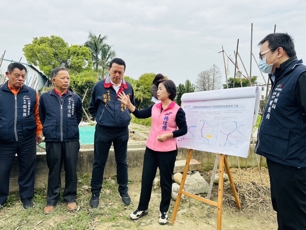 楊瓊瓔說,大雅員林里、雅楓里塔蓮溝中下游區段將施設長400公尺,深4公尺的半重力式擋土牆護岸,徹底防阻溪洪持續淘刷,雖然經費要3000萬元,但攸關農民生命財產安全,中央及地方一定籌措經費,加速改善,讓兩岸農田不再受沖刷流失之險,並且大大增加河道安全,最重要是能避免土坡持續滑落,造成河道淤塞阻礙水流,一定要讓農民安心務農、居民安心樂業,身家安全都有保障。楊瓊瓔強調會協助水利局爭取水利署補助經費,加強改善各地渠道排水防洪能力,以維民眾生命財產安全。