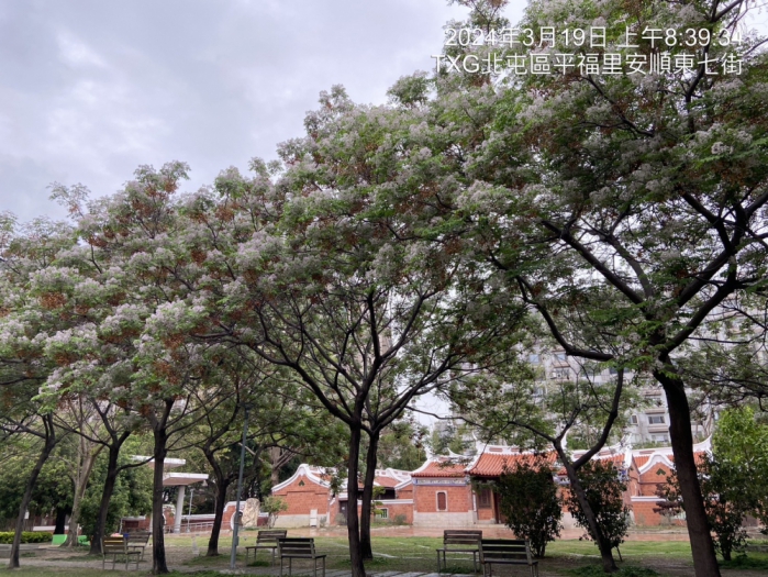 建設局指出,清水區鰲峰山公園、北屯區民俗公園、北區梅川園道、后里區運動公園,以及西大墩公園、東英公園、健康公園、半平厝公園、軍功公園、高鐵新市鎮生態公園等,皆可發現苦楝開花的蹤跡,而西屯區的潮洋溪畔,有株白花苦楝樹王,樹冠上佈滿白色小細花,與潺潺的潮洋溪流、湛藍的天空,交織出優雅的春日景致。