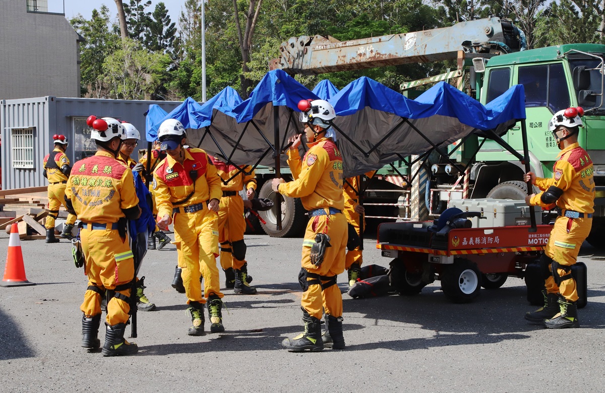會議結束後,應變中心人員移師消防局後方廣場成立災害現場「嘉義縣政府前進指揮所」實施實兵演練,確保在真實災害發生時能有效救援,翁縣長也逐一檢視包括前進指揮所、災害指揮中心、搜救隊等業務流程。