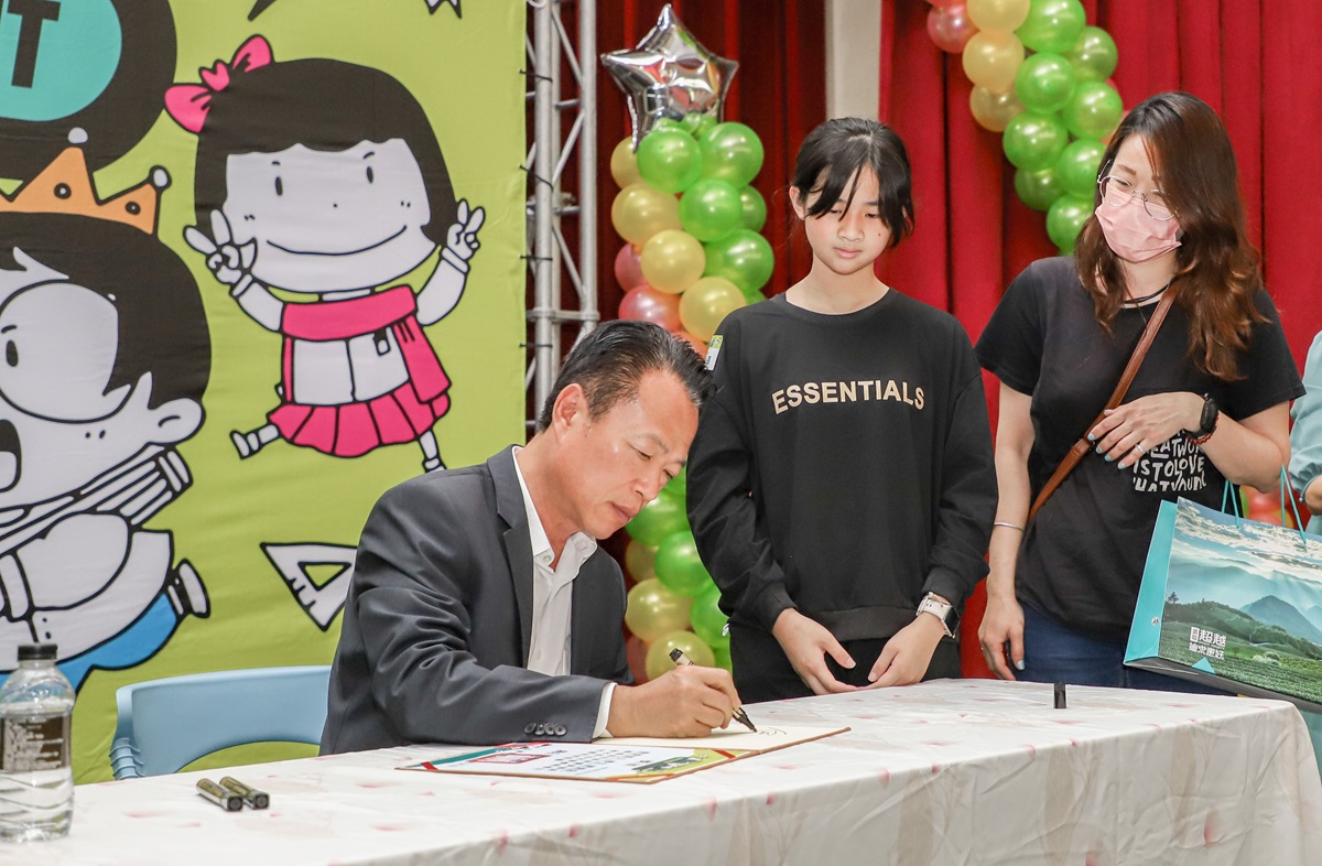 縣長翁章梁在創新學院頒獎表揚及合影留念,並在典禮尾聲為受獎學生簽名勉勵。