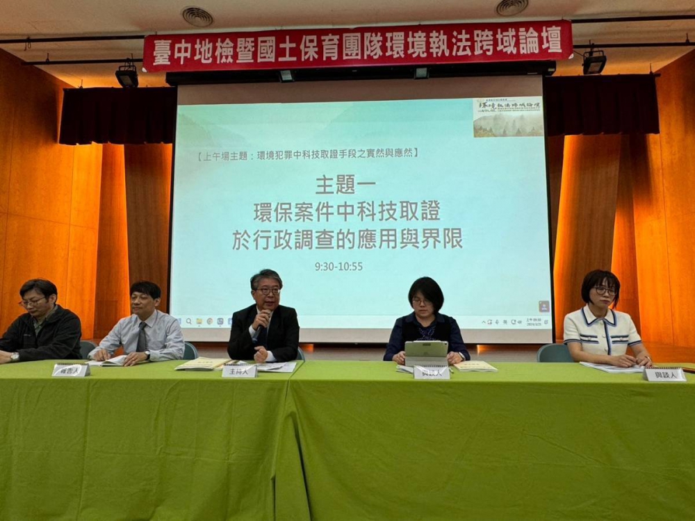 法務部檢察司、台灣高等檢察署、台中地方檢察署代表、中興大學、世新大學、銘傳大學法律相關學系教授、環管署中區環境管理中心及台中環保局代表分別擔任各議題的主持人、報告人及與談人,提出專業知識及法律見解,跨領域進行多方交流及經驗分享。
