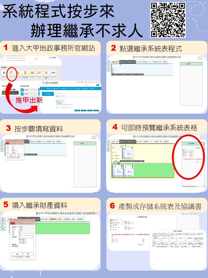 楊政儒提到,大甲地所自行研發繼承系統書表及分割協議書製作系統相當親民,只要按照步驟輸入資料便可獨立完成。另繼承系統表還有顯示各繼承人潛在應繼分的功能,方便民眾換算土地建物所有持分填載權利範圍,藉此創新可降低繼承案件補正機會及提高審件速度。