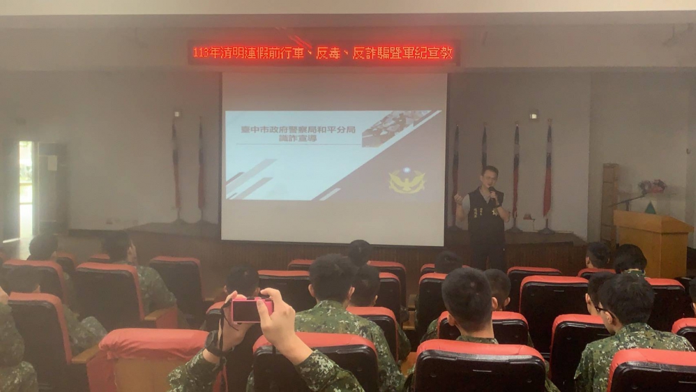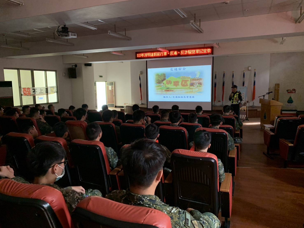 【記者林獻元台中報導】清明連假前夕,和平警分局「治、交安宣導團隊」前進原鄉麗陽營區「反詐騙及交通安全」宣導,期望透過面對面宣導,全面提升國軍戰士,對於識詐及交通安全的防護力,維護國軍用路與財產安全。