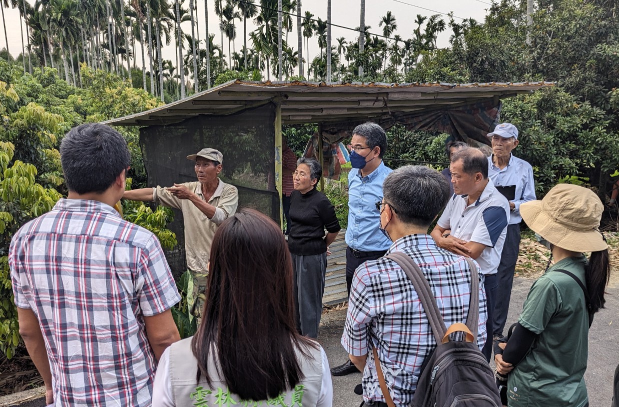 立委劉建國邀請分署主任黃冠富、農改場雲林分場長黃瑞彰及助理研究員吳沛榕等專家,及鄉長林慧如、議員張庭綺、永光村長賴茂行會勘果園。(圖/記者蘇榮泉攝)