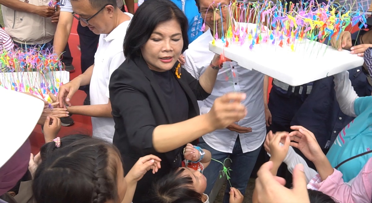 縣長張麗善與鎮長蕭美文分發小禮物給每位小朋友。