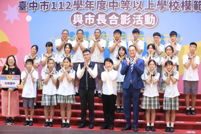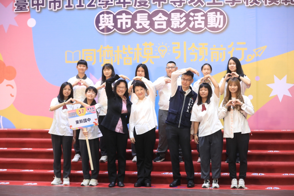 【記者林獻元台中報導】台中市政府教育局8日於台灣體育運動大學表揚112學年度全市國高中職及附設進修部、國小補校共5225名模範生,並由市長盧秀燕、教育局長蔣偉民與模範生一一合影。學生們想做什麼動作,市長盧秀燕有求必應,各種大小愛心、泰雅族圖騰、比英文字、臉上開花等,盧秀燕全部配合。盧秀燕表示,這是一個共好共善的社會,期許模範生們不只讓自己好,也發揮自身影響力,讓同學、朋友一起好。