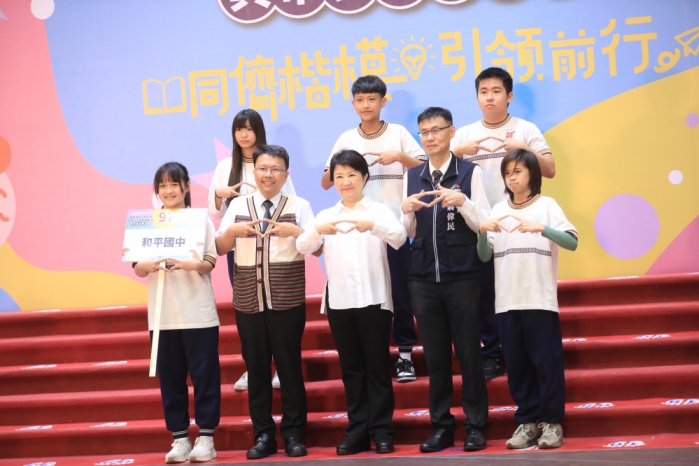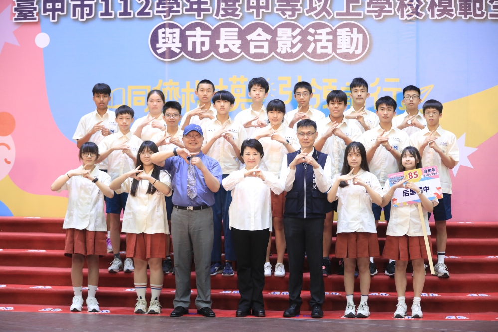 市長盧秀燕全力配合學生們擺出各種創意姿勢合影,包括臉頰愛心、臉上開出小花、向前行、英文字、航向遠方等,后里國中還用手指比出「后」字,和平國中也用手指比出泰雅族圖騰,現場盧市長與學生們玩在一起,氣氛熱鬧歡樂。