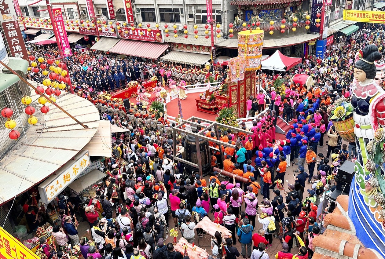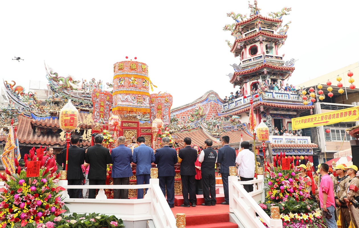 【記者蘇榮泉嘉義報導】大甲鎮瀾宮媽祖9天8夜遶境進香,接近9日凌晨,大甲媽在信眾恭迎下,駐駕嘉義縣新港奉天宮,9日上午8點舉辦媽祖祝壽大典,縣長翁章梁、大甲鎮瀾宮董事長顏清標、奉天宮董事長何達煌、立委顏寬恆、奉天宮副董事長林秀琴等率各宮廟代表頂禮膜拜,虔誠祝禱,祈求媽祖庇佑國泰民安,人民安居樂業。